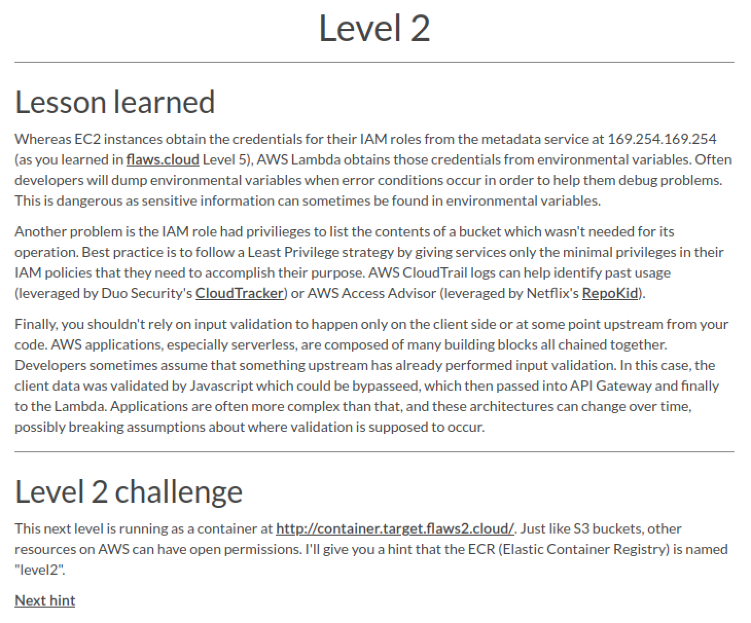 This next level is running as a container at http://container.target.flaws2.cloud/ Just like S3 buckets, other resources on AWS can have open permissions. I'll give you a hint that the ECR (Elastic Container Registry) is named "level2".